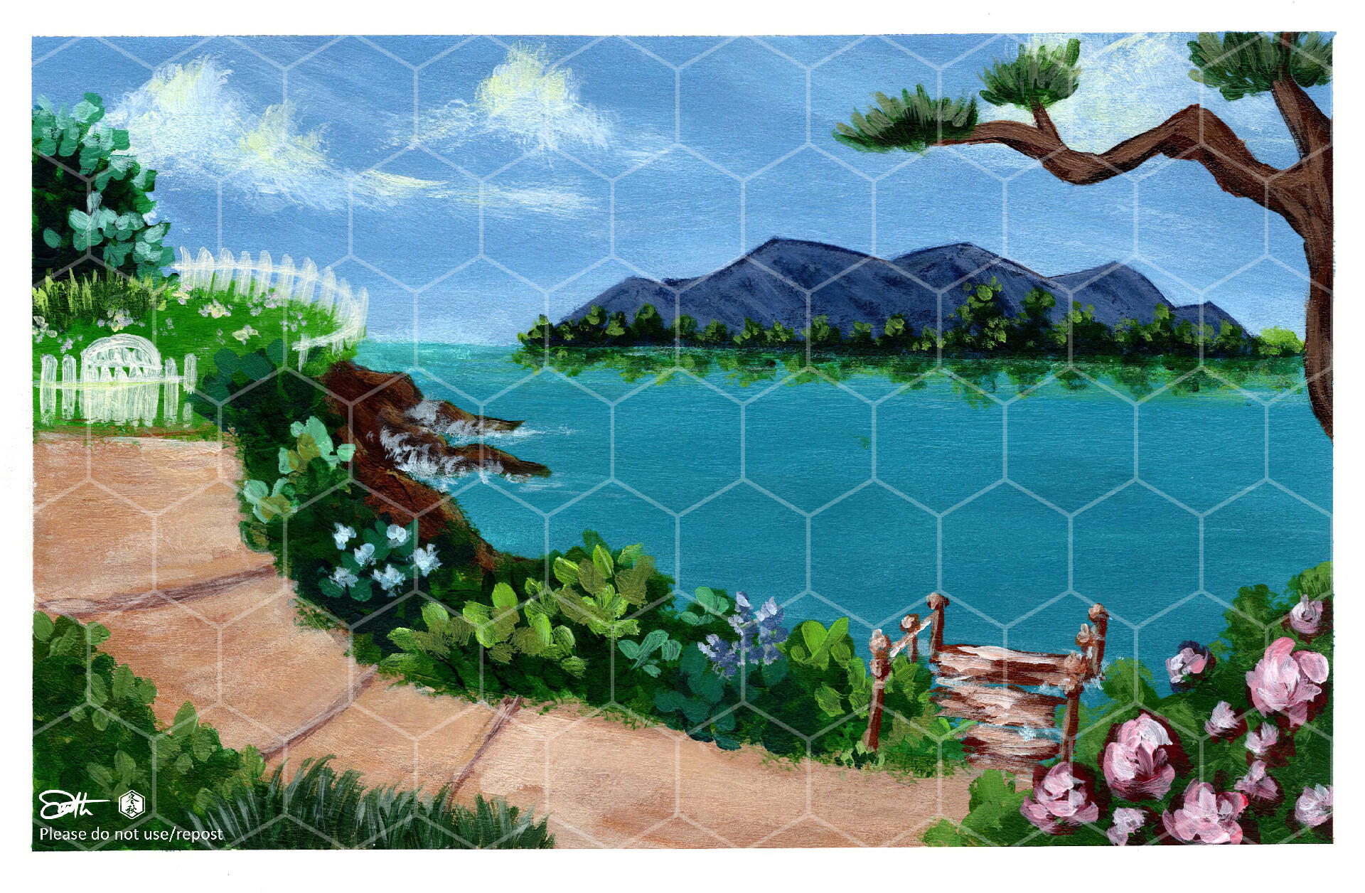 Originally painted with acrylic on paper, this painting depicts an azure oceanscape with a distant mountain range. An uncanny dirt path flanked by foliage leads from run-down wooden pier towards a surreal garden, protected by white fences. The light blue sky is wispy with faint clouds.Not intended or licensed for commercial use!
