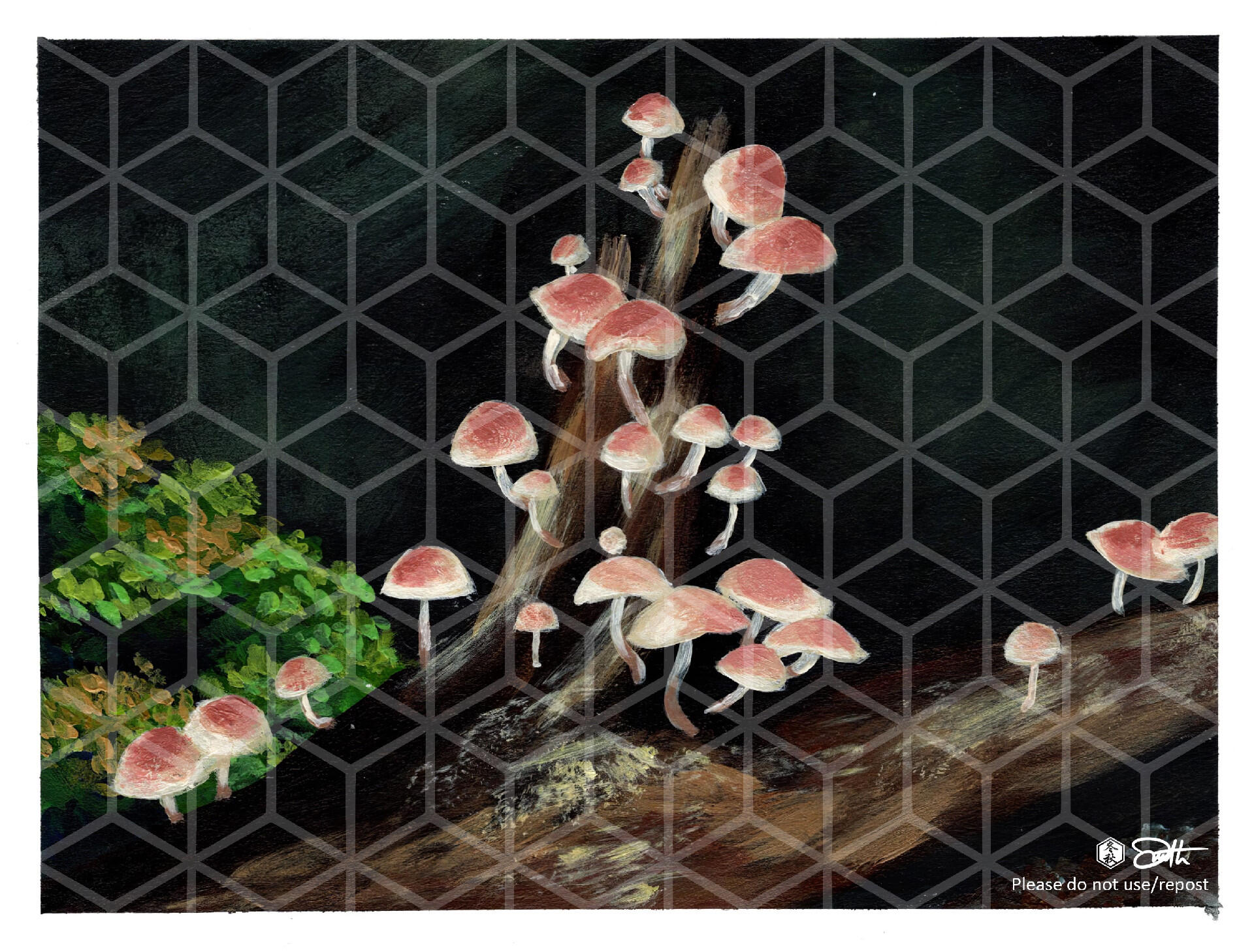 Originally painted with acrylic on paper, this painting depicts a smattering of idyllic mushrooms sprouting all across the a lone rotting log sitting in the middle of an abyssal background. A bush of lush green leaves sit at the side, with a few yellowed wilting patches.Not intended or licensed for commercial use!