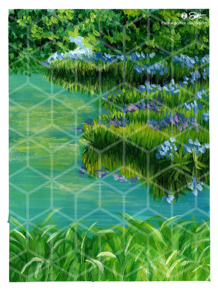 Originally painted with acrylic on paper, this painting depicts a beautiful emerald lake with dense vegetation across the view, topped with a layering of vibrant green foliage. The shrubs sprouting from the lake are dotted with flowers ranging in hue from blue to violet.Not intended or licensed for commercial use!