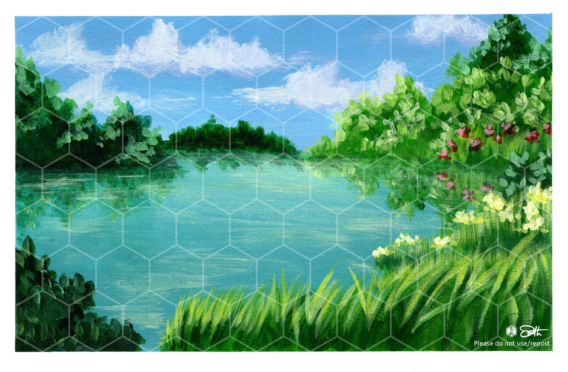 Originally painted with acrylic on paper, this painting depicts a gorgeous lake surrounded by thick shubbery and foliage. Thin wispy grass strands and thick leafy bushes. An assortment of pinkish-red flowers can be seen on the shoreline, reflected in the blue lake surface.Not intended or licensed for commercial use!
