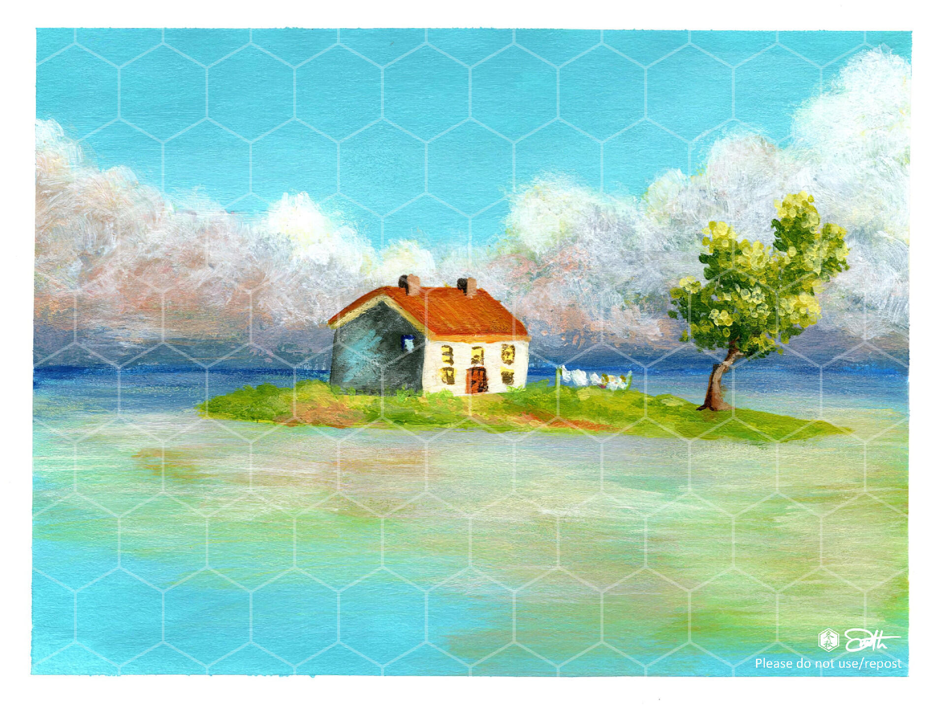 Originally painted with acrylic on paper, this painting is based on the film "Spirited Away" by Studio Ghibli. A vibrant view of a lonely, yet comfortable, looking house sits on an island with a tilted tree, topped full of leaves. Puffy white clouds stretch across the horizons.Not intended or licensed for commercial use!