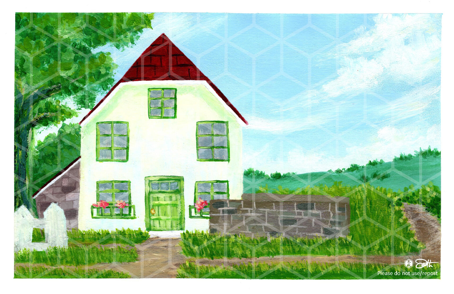 Originally painted with acrylic on paper, this painting is based on the location seen in the anime series "Fullmetal Alchemist". A front view of a clean striking house. A stone brick wall lines the right, while a white fence reaches off to the right. A large tree stands in the corner, lush green leaves weeping downward onto the house. The bright blue sky fills the frame over the horizon.Not intended or licensed for commercial use!