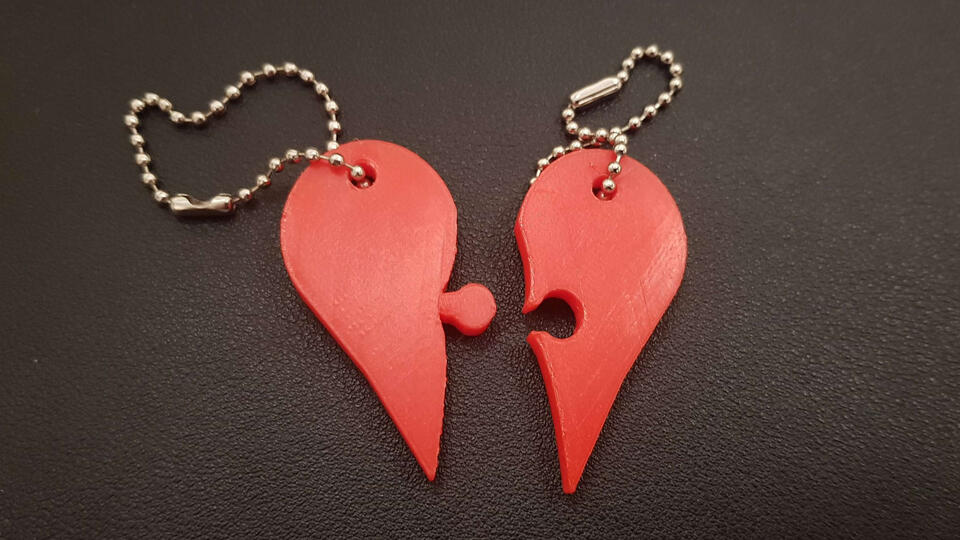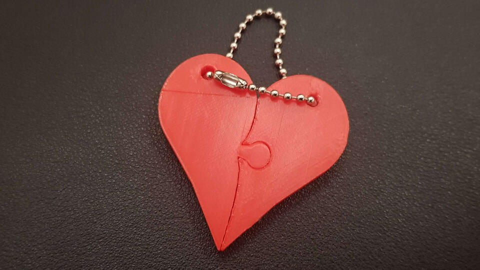 A symbol of love, one for you and one for your other to connect whenever you meet!Your purchase will give you a zip file containing 3D print files (in STL and 3MF format, made with PrusaSlicer) to make a keychain of two heart halves connected like a puzzle piece.Approx. size -W: 50mm